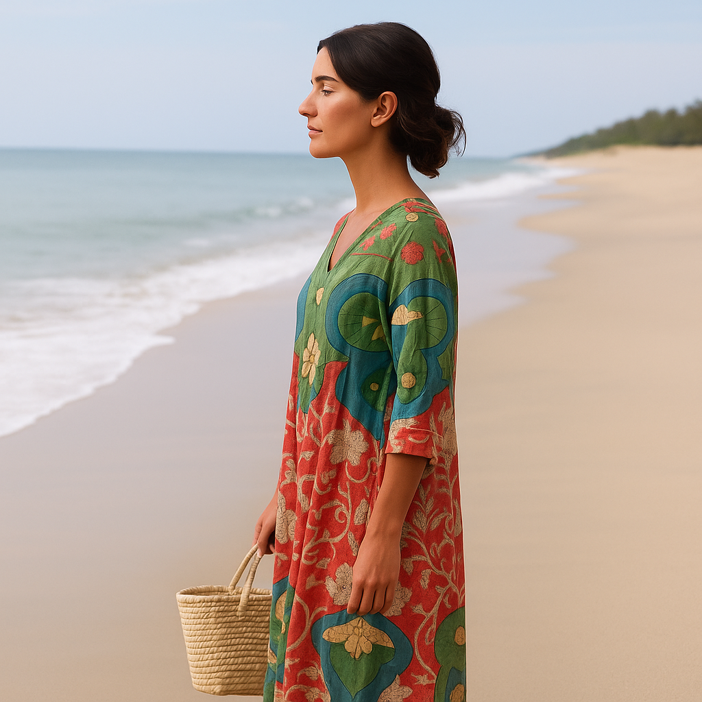 Este elegante vestido casual combina estampados vibrantes con una silueta relajada, lo que lo hace ideal tanto para paseos junto al mar como para salidas diarias. Con su escote en V, mangas tres cuartos y falda fluida, equilibra facilidad con un encanto llamativo.